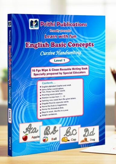 A reusable English cursive handwriting book designed to help children improve speed, neatness, and letter formation. Includes Basic Stroke practice for alphabet tracing, word-building, number names, rhyming words, fruits & vegetables names, opposites, plurals, months, days, and simple sentences. Made with durable 350 GSM shining art board, A4 Size - 16 Pages —kids cannot tear it. Specially prepared by expert special educators. A perfect gift to enhance your kids handwriting.