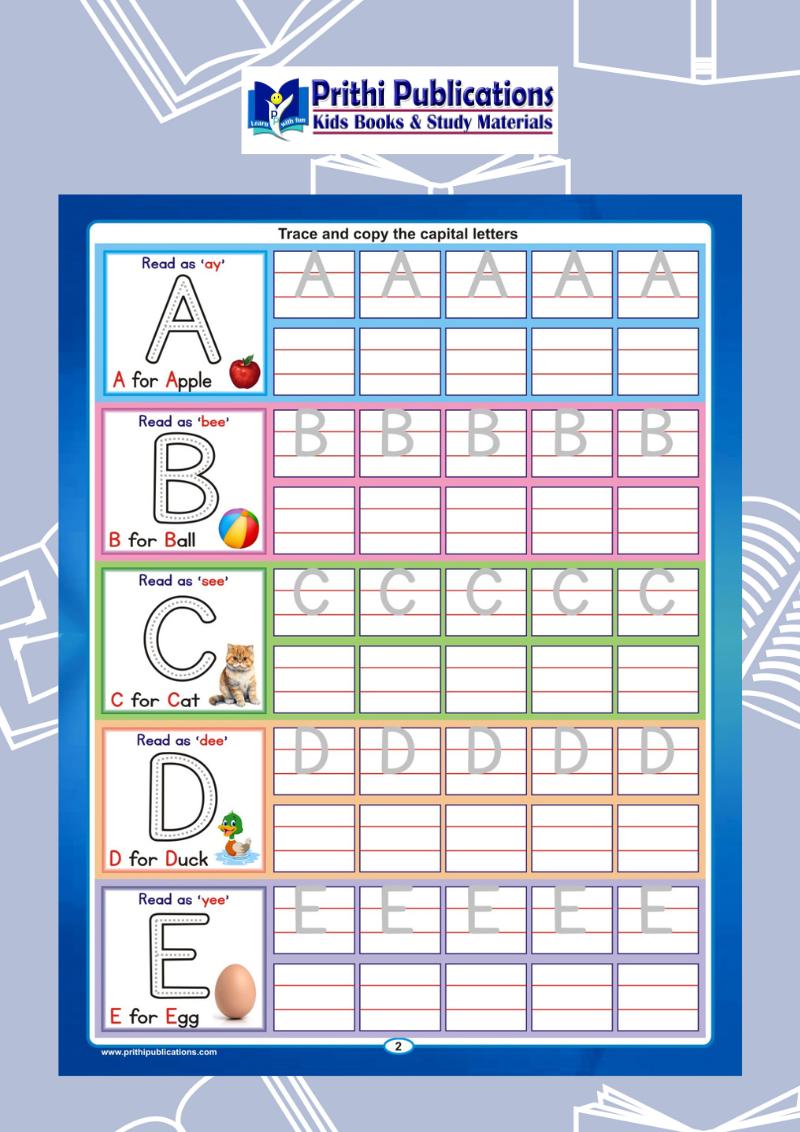 The book introduces children to basic English letters (A–Z) with both capital and small letter tracing, supported by colorful example words and pictures. Each page includes trace-and-copy methods, stroke practice, and guided letter formation to help kids develop strong writing skills.
