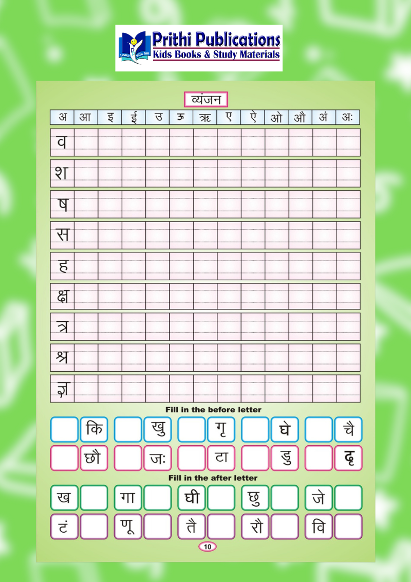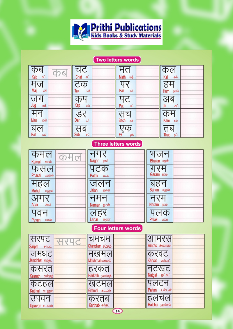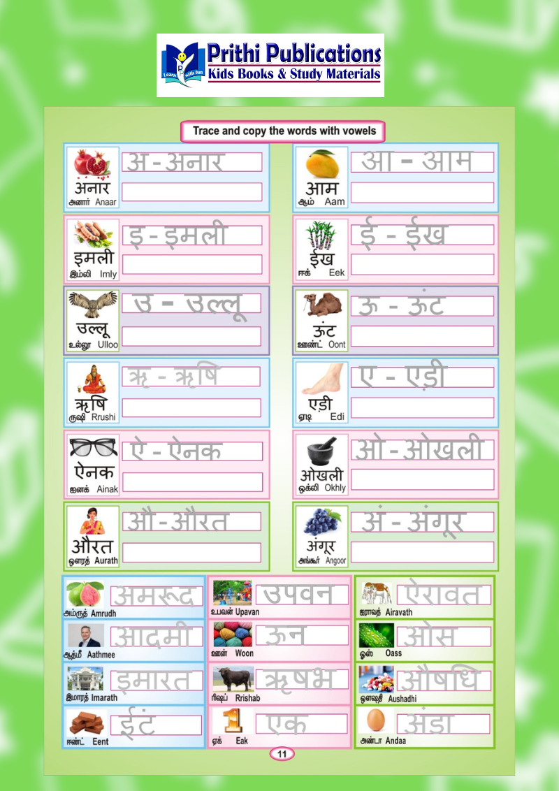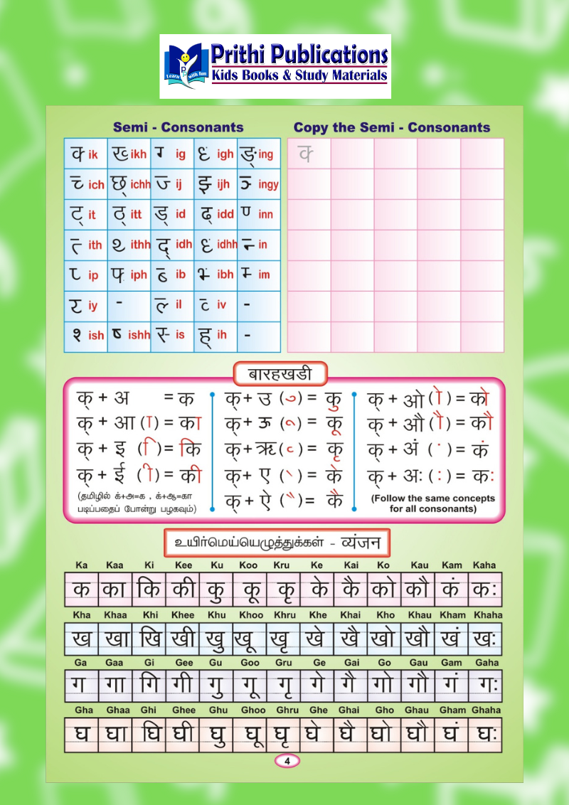 This book includes Swar and Vyanjan tracing, semi-consonants, Barakhadi (Bharagkadi) with English pronunciation, Tamil pronunciation references, picture-based vocabulary, and two-letter, three-letter, and four-letter word practice. It also covers number names, days of the week, colors, and more.