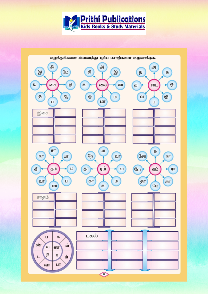 The activities gradually build Tamil literacy by teaching: