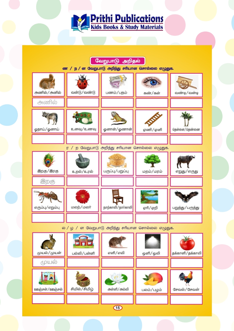 Each letter includes picture-based examples, tracing boxes, and practice spaces, helping children learn through visual connection and repetition. With 247 letters and word-writing activities, kids gain a strong foundation in Tamil reading and writing.