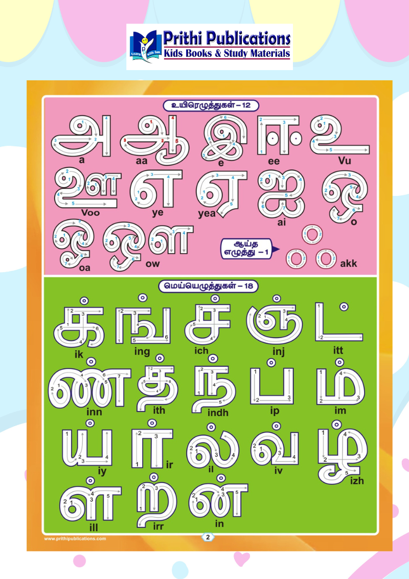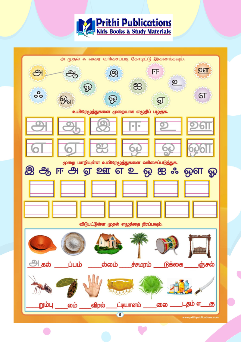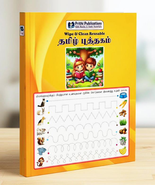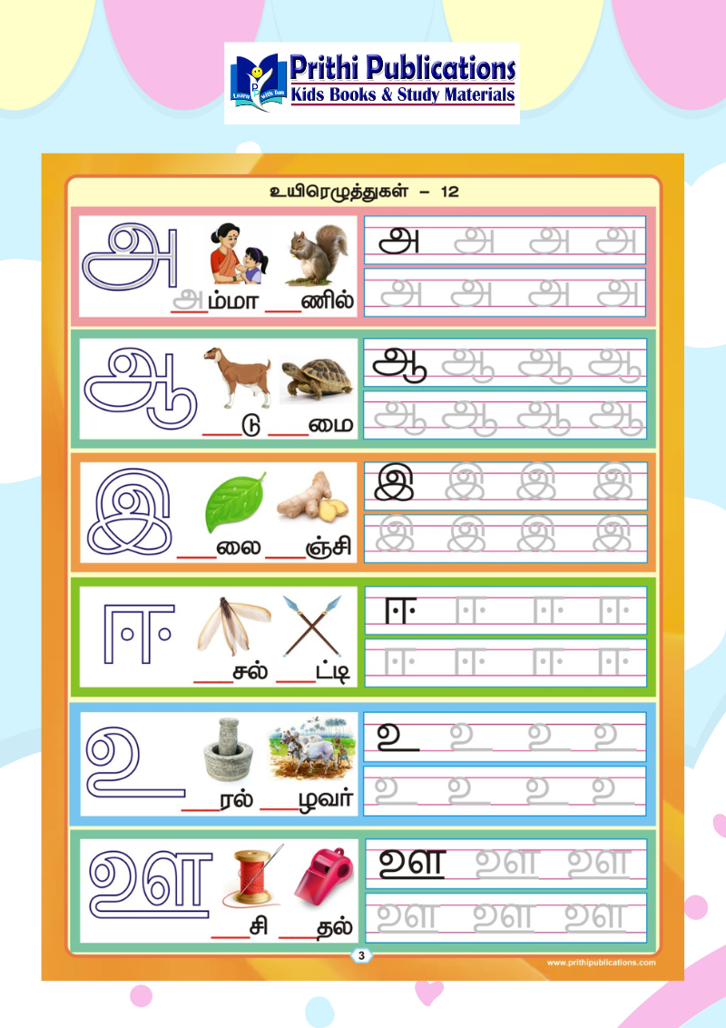 This 16-page book begins with basic stroke practice, followed by Tamil Uyireluthukkal and Meyyeluthukkal writing exercises, supported with example words and attractive pictures. Children learn to identify letter shapes, sounds, and small words through fun visual cues.