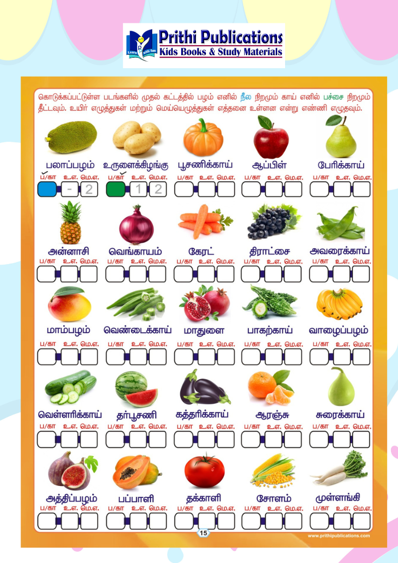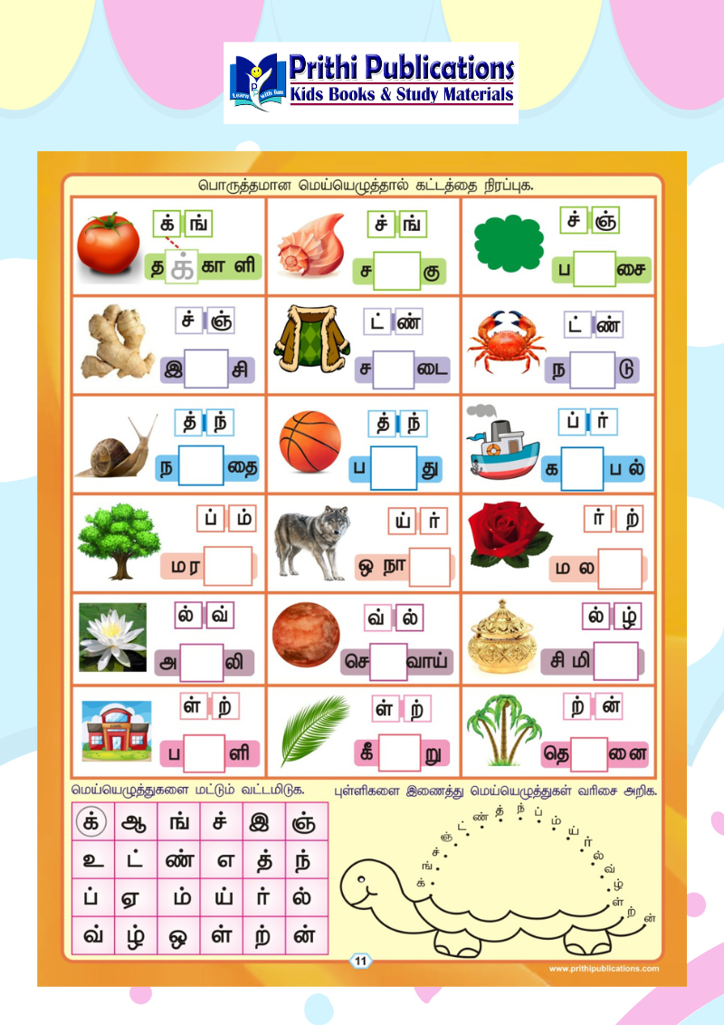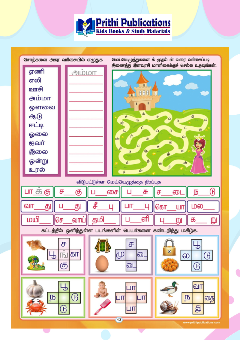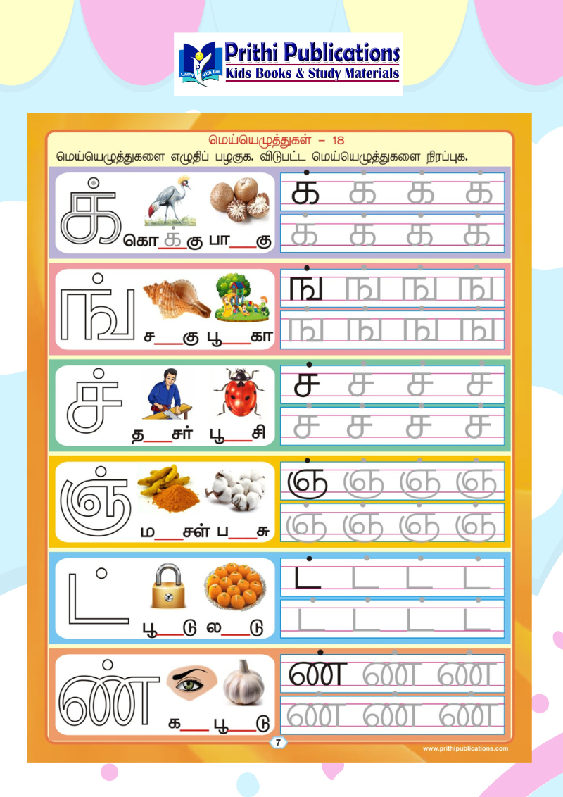 This 16-page book begins with basic stroke practice, followed by Tamil Uyireluthukkal and Meyyeluthukkal writing exercises, supported with example words and attractive pictures. Children learn to identify letter shapes, sounds, and small words through fun visual cues.